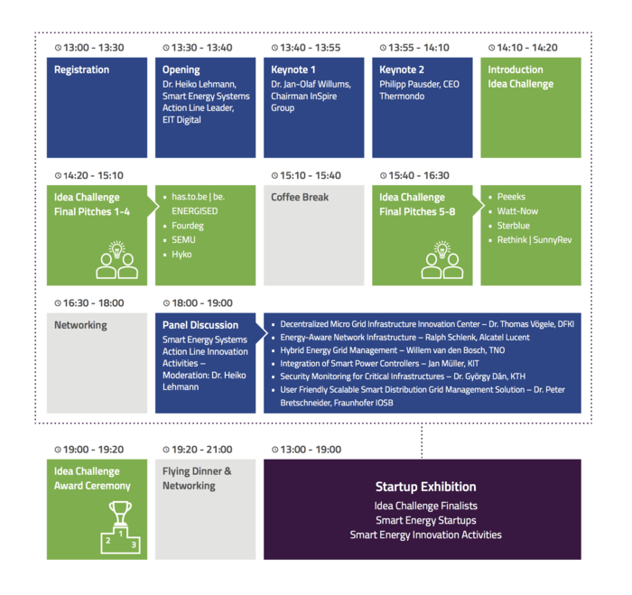 Following up on the successful first edition in 2014, EIT Digital once again brings together cutting-edge European innovation, leading industrial players and a vibrant startup-scene in the field of Smart Energy Systems for a unique event. We invite you to a day packed with gripping keynotes on entrepreneurship and innovation, the final pitches of the pan-European startup competition “Idea Challenge” and insights into the machine room of Smart Energy innovation.