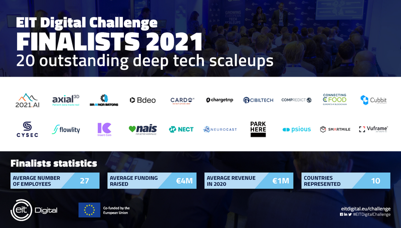 The EIT Digital Challenge takes place for the eighth consecutive year and focuses on ‘deep tech’ digital scaleups with a differentiating product offering, leveraging sophisticated, hard-to-reproduce digital technologies that fuel the digital transformation. The finalists were chosen out of 409 applicants and come from 10 different European countries. On average, they reached a revenue of €1M in 2020, raised €4M funding and employ 27 people. A noteworthy fact is that 45% of finalists feature women as founders or C-level executives.