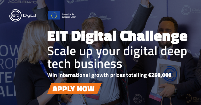The EIT Digital Challenge, the leading competition for European digital deep tech companies, is now accepting applications. Fast-growing startups with existing customers - so called scaleups - are invited to apply in one of five thematic areas: Digital Tech, Digital Cities, Digital Industry, Digital Wellbeing and Digital Finance. The best three companies will receive prizes totalling €250,000 in cash and in kind. The application deadline is 10 May 2021.