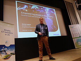 Patrick Strating, Node Director Eindhoven opened the event and acted as moderator. He introduced the Mayor of Eindhoven, Rob van Gijzel. The Mayor welcomed the international audience with a keynote on the impact of ICT as a crucial key enabling technology for Europe’s industrial and societal future and in particular for the Brainport region. He expressed the hope to see more of EIT ICT Labs’ achievements as he acknowledged that to maintain a competitive position, industry needs to be strong in ICT-innovations. This was followed by a presentation by the action line leader of Health & Wellbeing, Jean Gelissen, who gave a short introduction on EIT ICT Labs, the Action Line Health and Wellbeing and an overview of the programme.