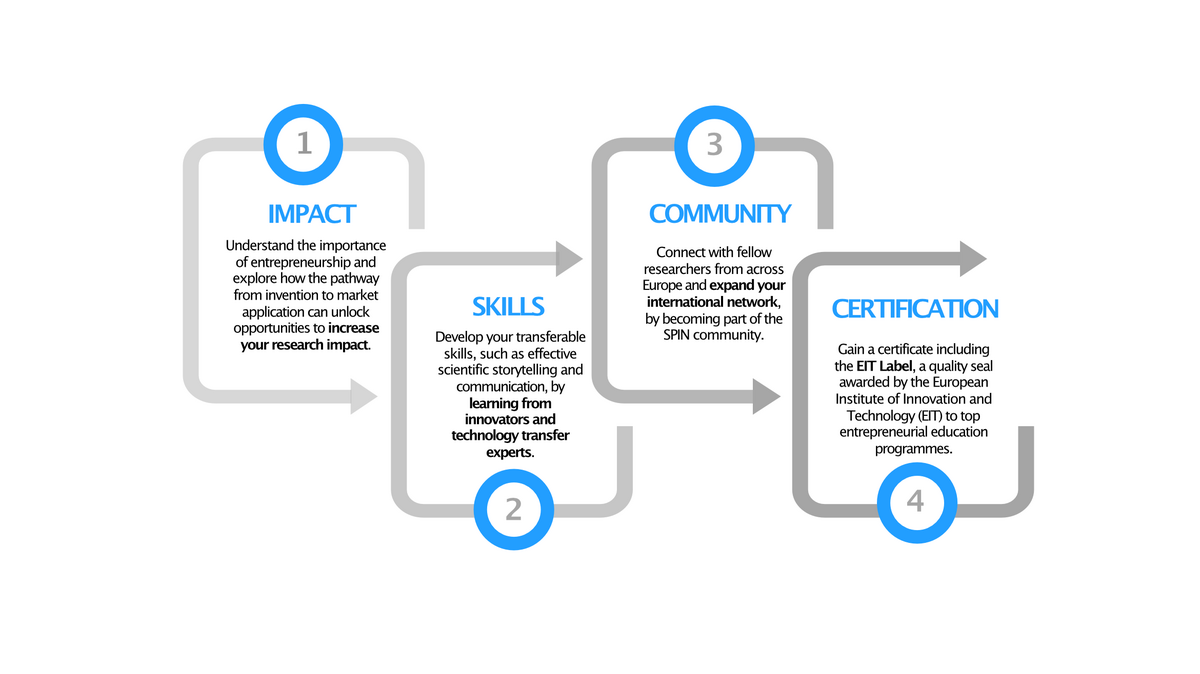 SPIN: Explore is a 9-hour online course designed to inspire and empower researchers and scientists, by equipping them with foundational business skills and stimulating their interest in the journey from lab to market. Structured into 3 modules, the course offers a practical introduction to the tools, strategies, and mindsets that help bring scientific innovations to market.