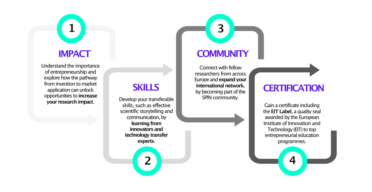 SPIN: Explore is a 9-hour online programme that helps researchers see their work from a broader perspective. Through six live online sessions, participants explore application pathways, technology transfer, and science communication. They leave with a practical framework to understand the problem their research addresses, articulate the impact they want to create, and frame their solution clearly for audiences beyond academia.